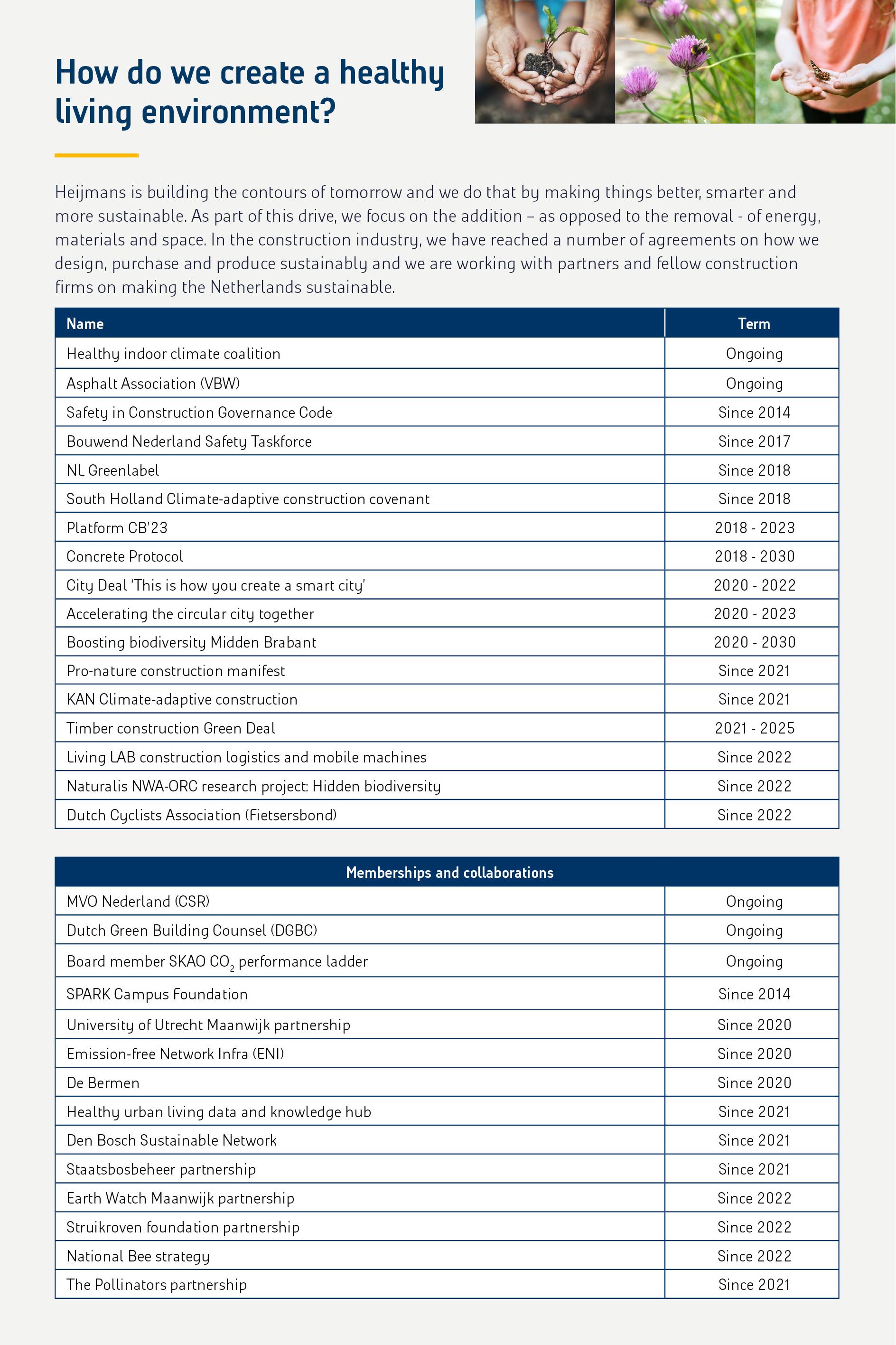 Heijmans is creating a healthy living environment by making its operation and work better, smarter and more sustainable. The social challenges we face are so complex that we actively seek collaboration with relevant parties. We make agreements and share knowledge, so we can work together to make the Netherlands sustainable.