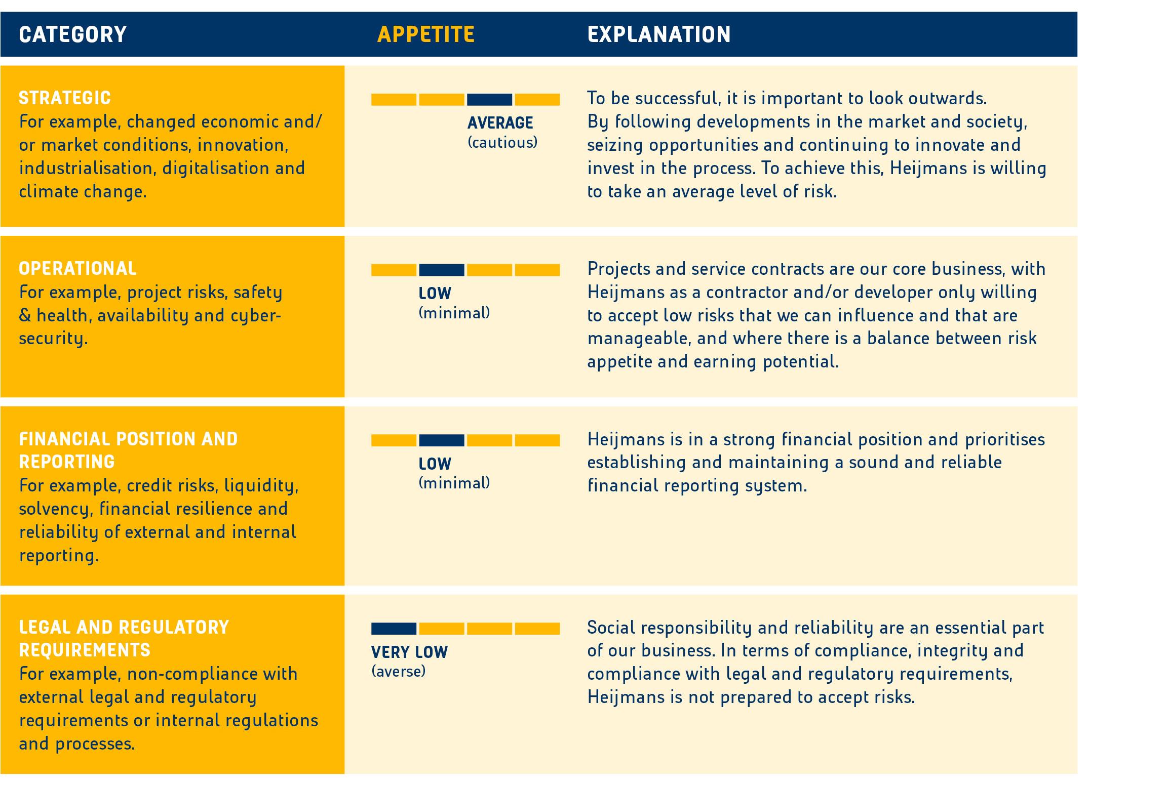 Risk acceptance refers to the level of risk that Heijmans is willing to accept or is exposed to in the pursuit of long-term value creation. Risk acceptance involves risk limits. These are determined by the company's culture, corporate governance and management systems, and are set out in our values, code of conduct, policies and procedures and authorisation schedules.