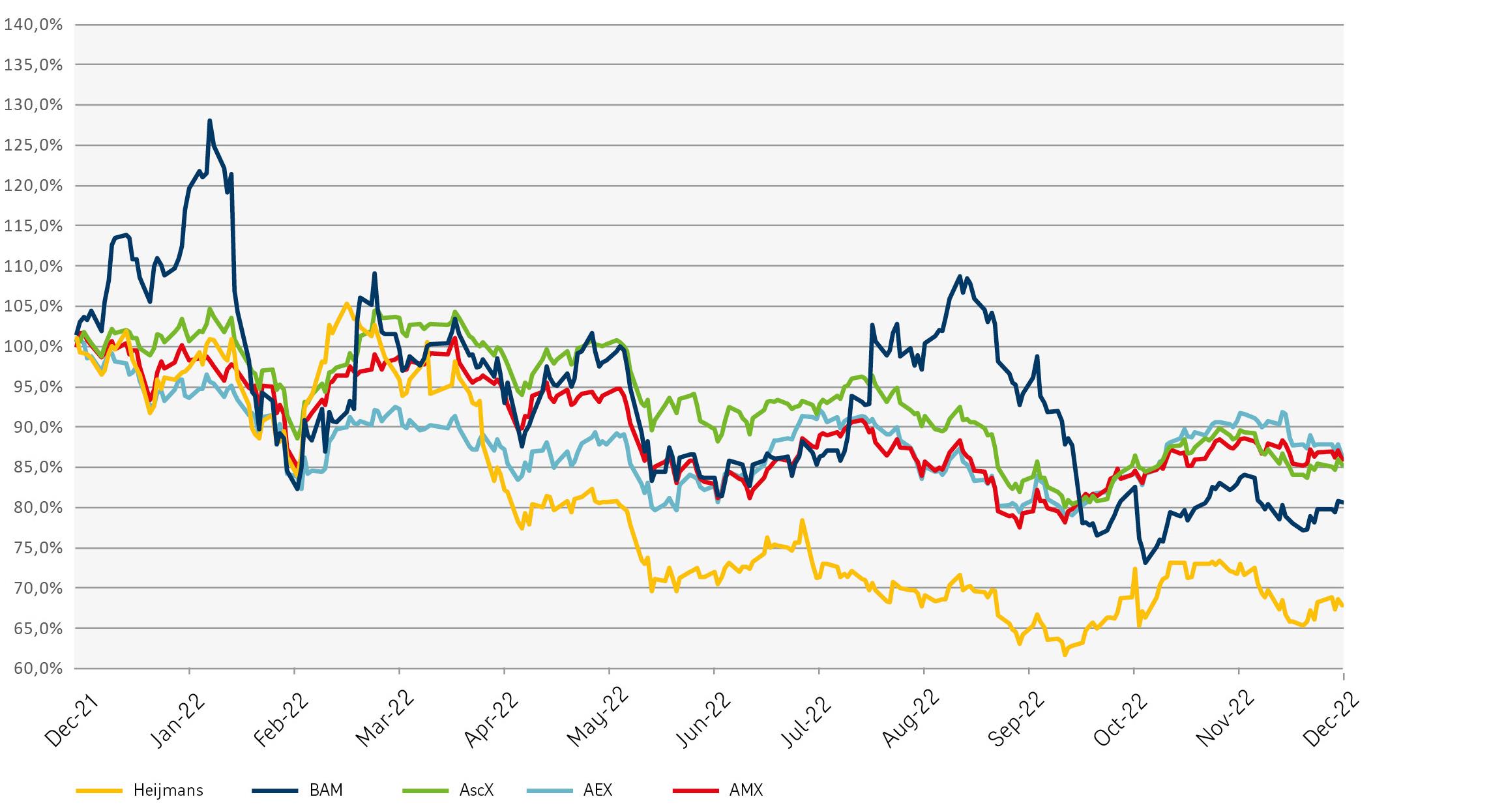 The closing price of the ordinary shares was € 10.12 at year-end 2022. This was a decline of 32% compared to the closing price at the end of the 2021 financial year (€ 14.90), which was a worse performance than the AscX index, which fell 15% in the same period. Despite the fact that Heijmans repeatedly reiterated its result forecast during the year and also publicly announced that the Porthos case ruling on the nitrogen emissions issue had no material impact, the share price suffered from the poor sentiment on the housing market in particular. The chart shows the Heijmans share price movement in 2022 compared to the AscX index, the AEX and the AMX, as well as to the other Dutch listed construction company BAM.
